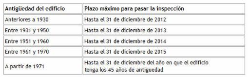 En general están obligados a pasarla y obtener el certificado de aptitud los edificios de más de 45 años. Sin embargo, dado que la normativa es reciente, con aprobación en 2010, se ha propuesto un calendario de adaptación a la norma siguiendo los siguientes plazos: